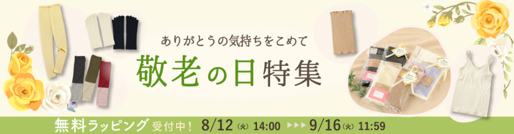 来月、9月15日(月)は敬老の日です。大切な方に、日頃の感謝の気持ちを込めて、普段のスタイルにも取り入れやすい天然素材のインナーや靴下を、贈り物にしてみてはいかがでしょうか。
