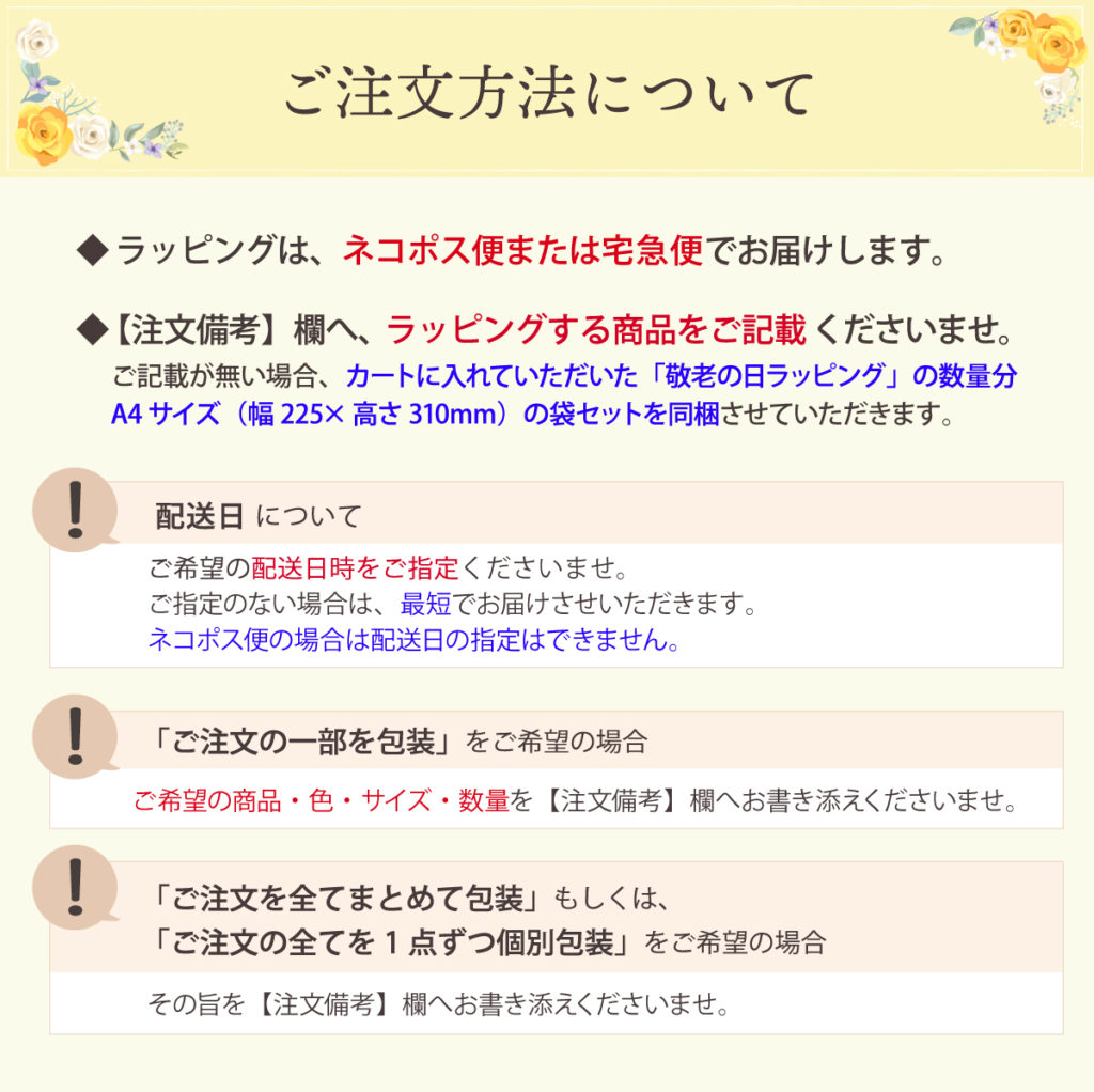 もし、ご記載がない場合は、カートに入れていただいた「敬老の日ラッピング」の数量分、A4サイズ(幅225×高さ310mm)の袋セットを同梱させていただきます。
