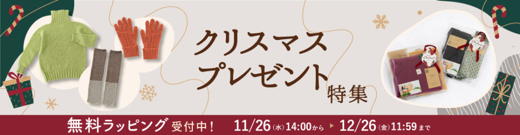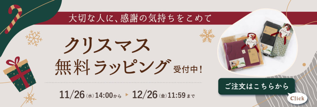第六弾は、天然素材の優しさと温もりを日頃お世話になっている大好きな方々へお贈りいただけたら嬉しいと思い、クリスマスプレゼントのラッピングを無料にて承らせていただきます。皆様からいただきました温かい思いやりの心を大切に、私どもの感謝の気持ちも一緒にお包みいたします。