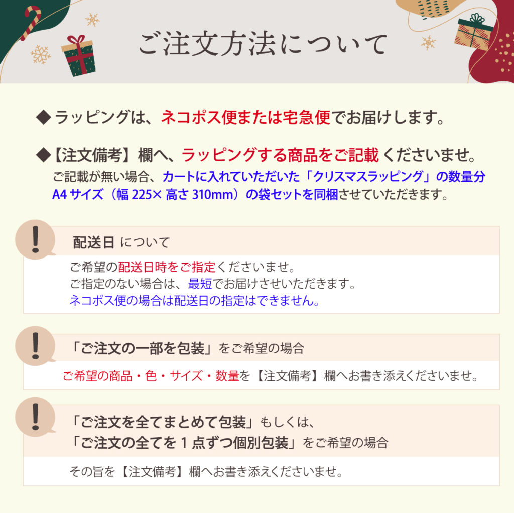 もし、ご記載がない場合は、カートに入れていただいた「クリスマスラッピング」の数量分、A4サイズ(幅225×高さ310mm)の袋セットを同梱させていただきます。