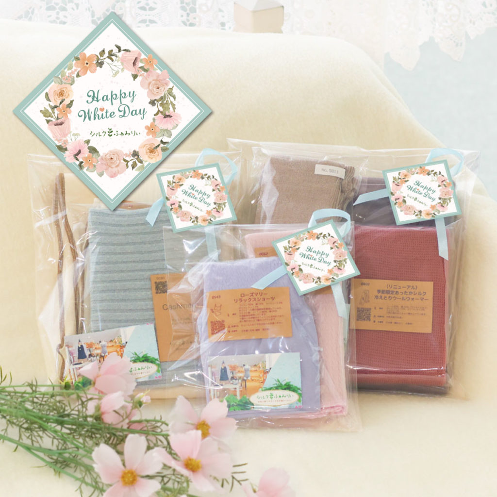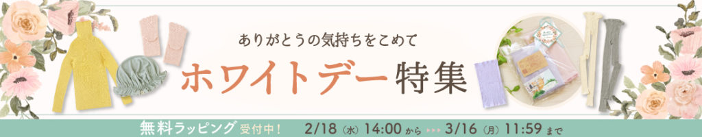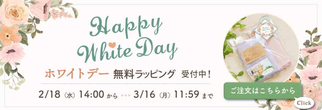 バレンタインのお返しに優しさと温もりたっぷりの天然素材アイテムを選んでいただきたいと、期間中ホワイトデー無料ラッピングを受付させていただきます。いつもいただいております皆様からの温かい思いやりの心を大切に、私どもの感謝の気持ちも一緒にお包みいたします。贈る方にも贈られる方にも喜んでもらえたら嬉しいです。