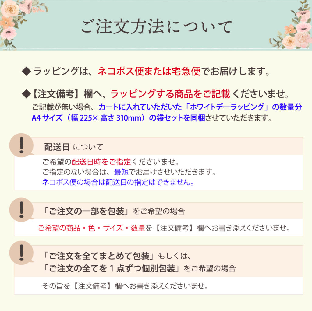 ご注文品すべてをラッピングする場合も、その旨をお書き添えくださいますようお願い申し上げます。